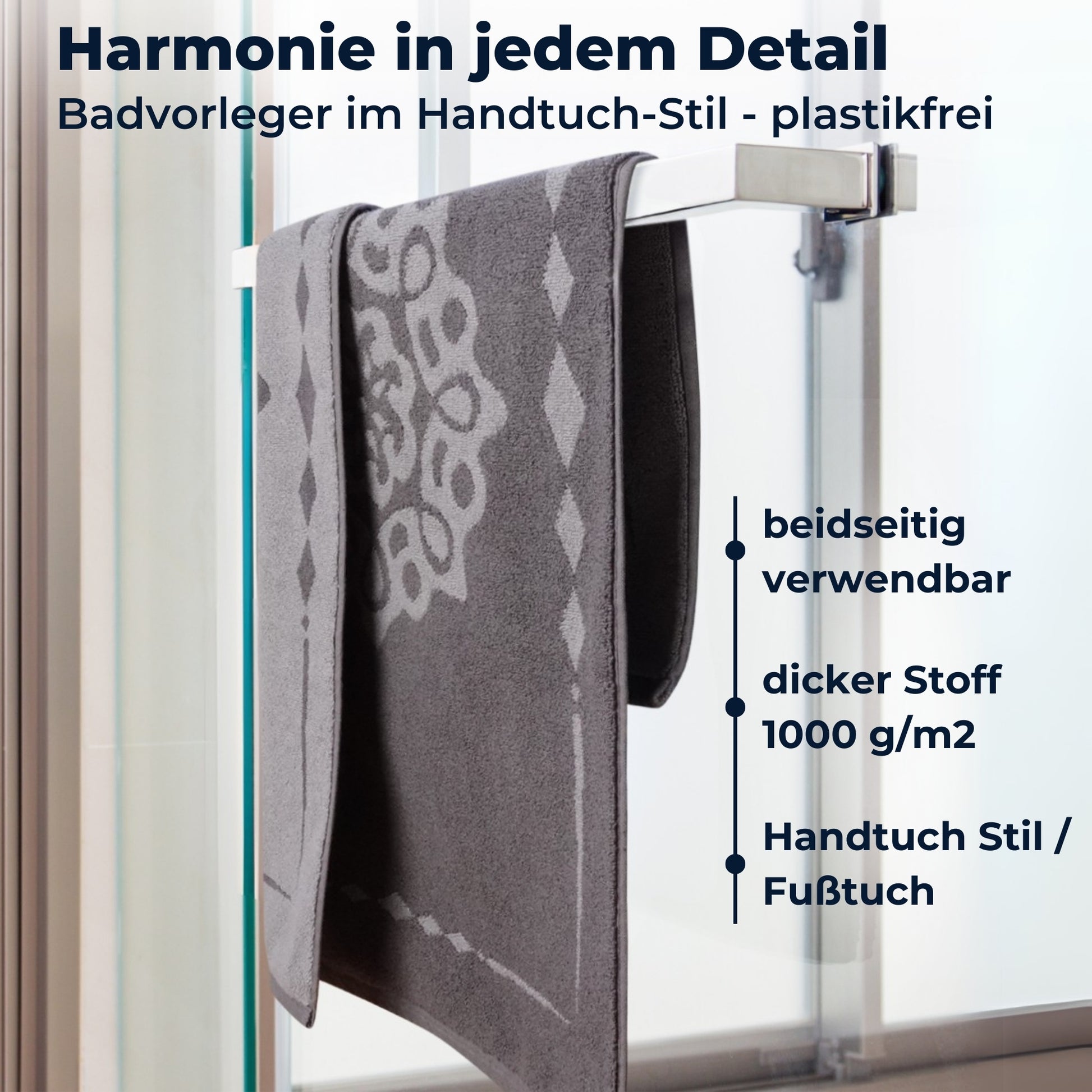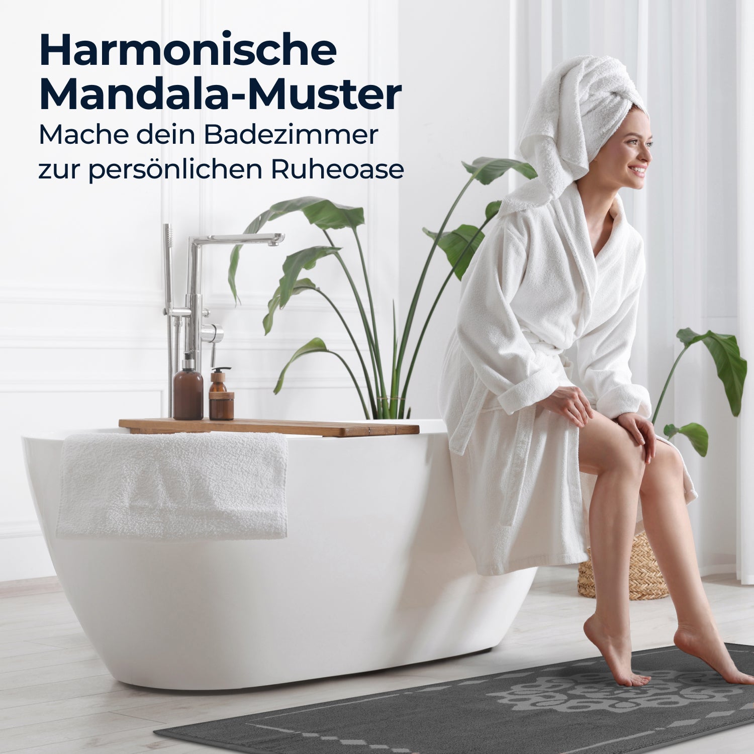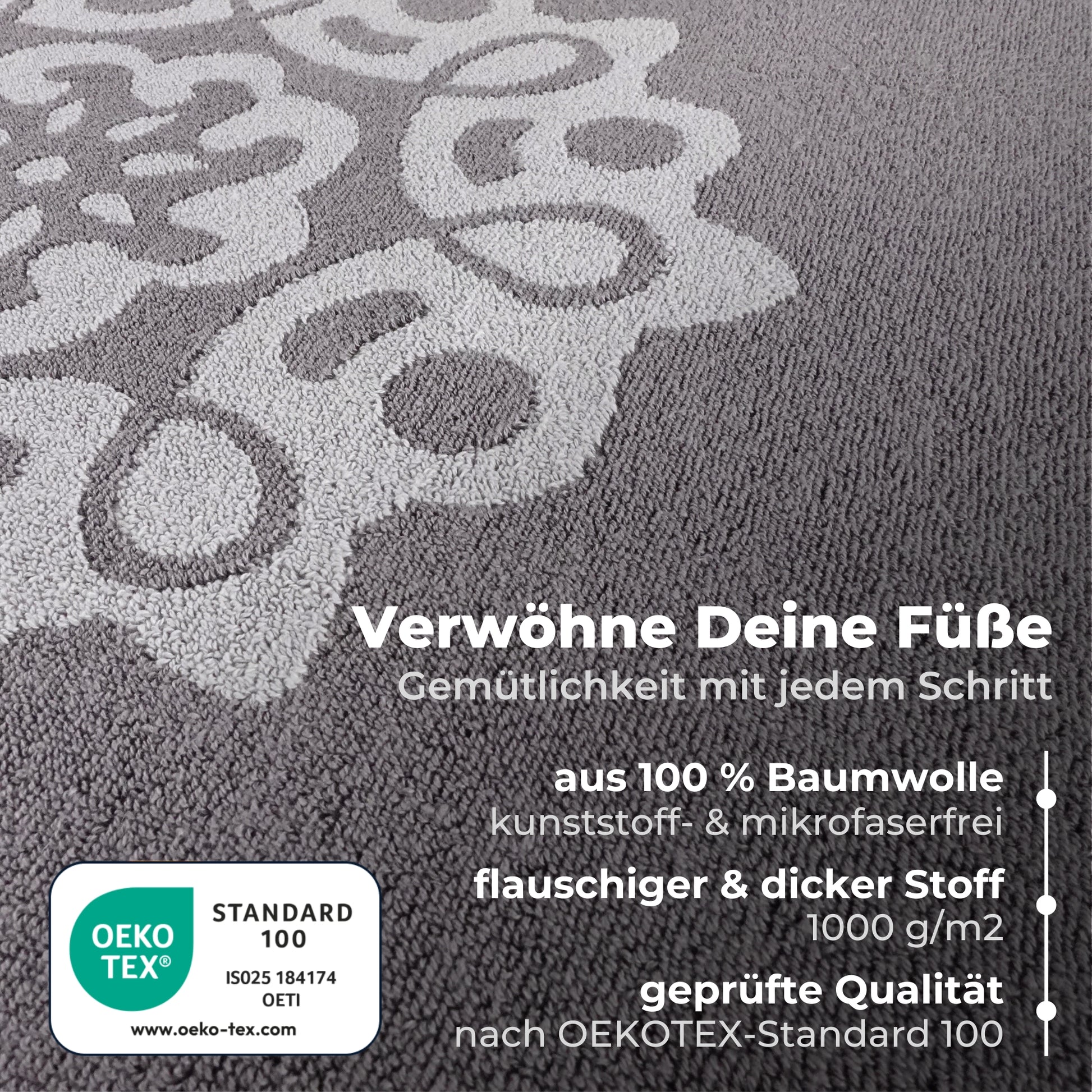 ELEVAVIDA® Design Badvorleger 100% Baumwolle 1000 g/m2 - grau mit Mandala - maschinenwaschbar, schnelltrocknend - Harmonie für Dein Badezimmmer