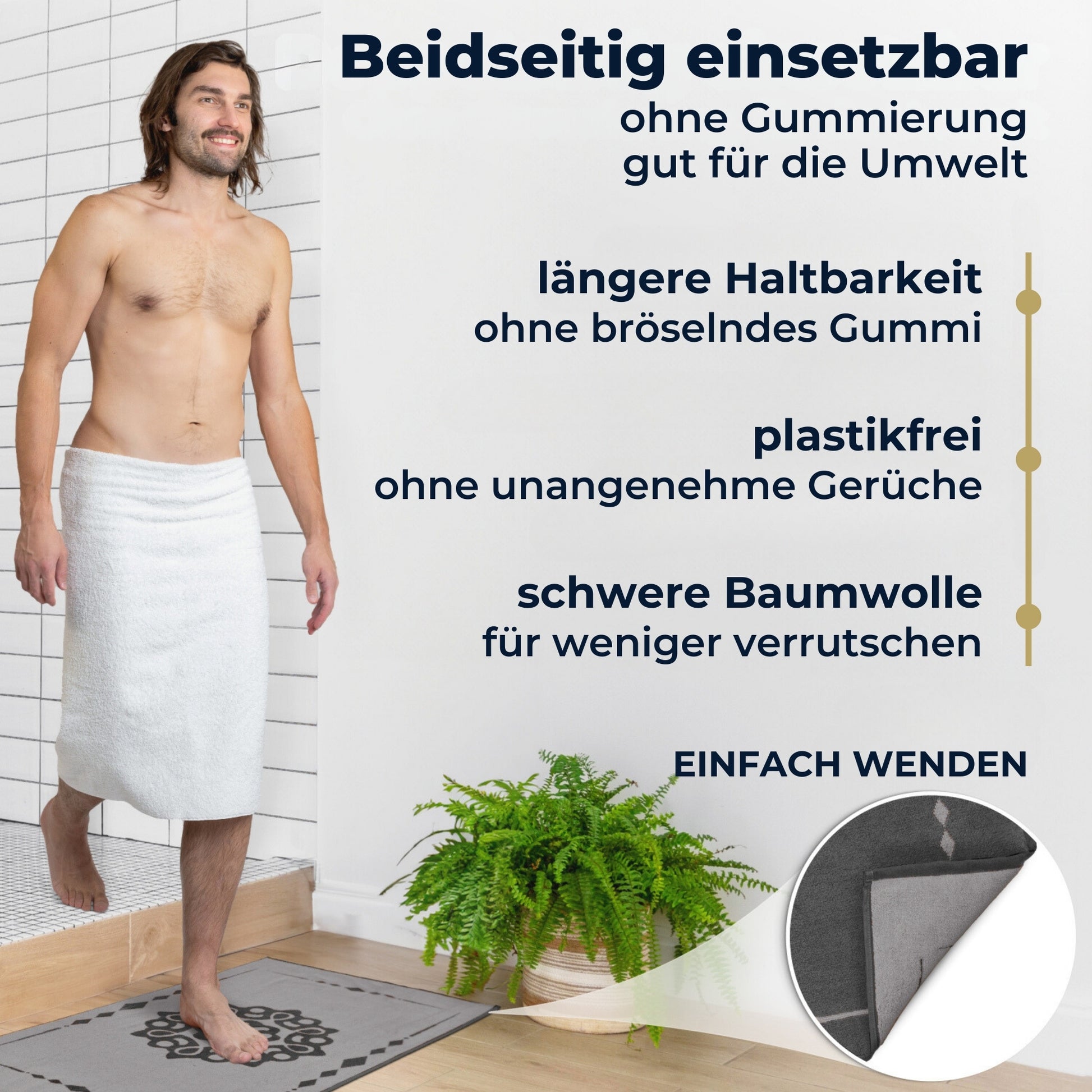Unsere Badematten werden in der Türkei in einem Familienbetrieb aus reiner Baumwolle hergestellt und sind OEKO-TEX Standard 100 zertifiziert, um höchsten Qualitätsstandards gerecht zu werden. Wir legen Wert auf Nachhaltigkeit und Umweltschutz und verpacken die Duschmatte plastikfrei in einem schönen Geschenkkarton. 100% Baumwolle & 100% natürlich: hergestellt aus 100% weicher, reißfester Baumwolle - kein Kunststoff, Gummi oder PVC.