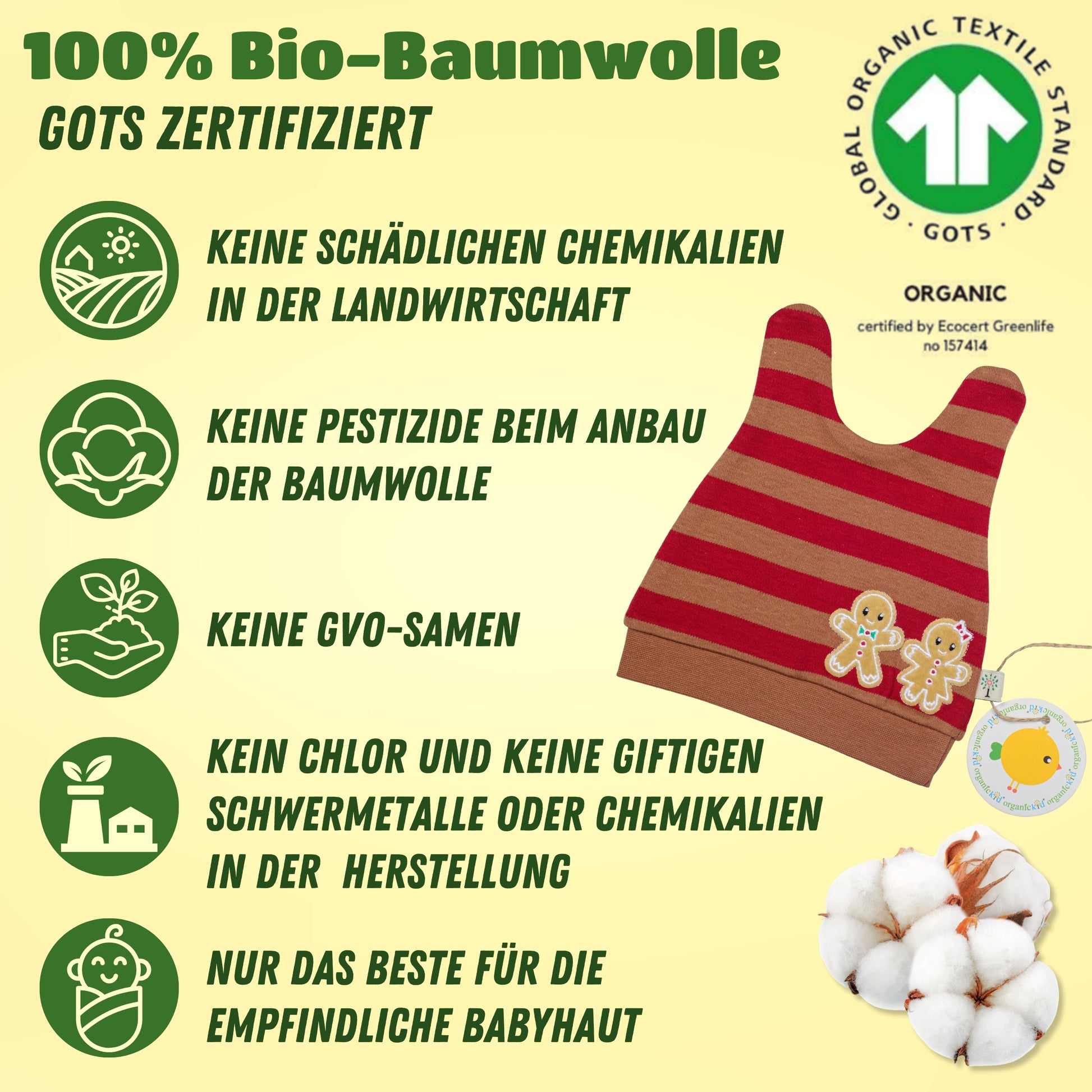 Unsere Übergangsmütze für Babys wird in Europa aus 100%-iger atmungsaktiver Bio-Baumwolle produziert. Wir sind GOTS zertifizert, welches einer der höchsten Zertifizierungen für Bio-Textilien ist. Die Farben unserer Säuglingsmütze sind frei von schädlichen Chemikalien.