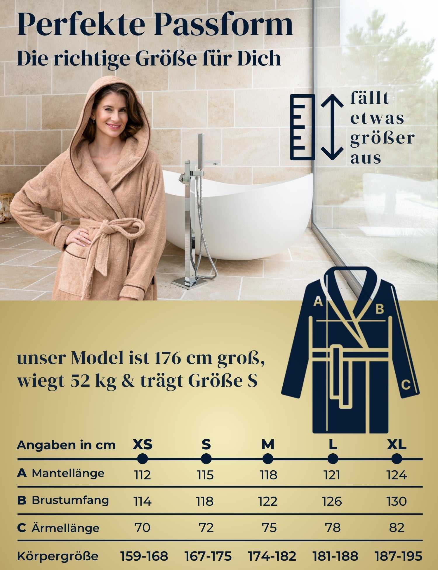 Bewege Dich frei in diesem cappuccinofarbenen, knielangen Damen Bademantel mit edler Paspelierung in mokkabraun: in der Sauna, Therme, Haman, Spa oder zu Hause. Die großzügige Kapuze schenkt Deinem Kopf und Ohren wohltuende Wärme und der modische Schnitt mit Raglan-Ärmeln gewährleistet eine bequeme Passform und uneingeschränkte Bewegungsfreiheit.