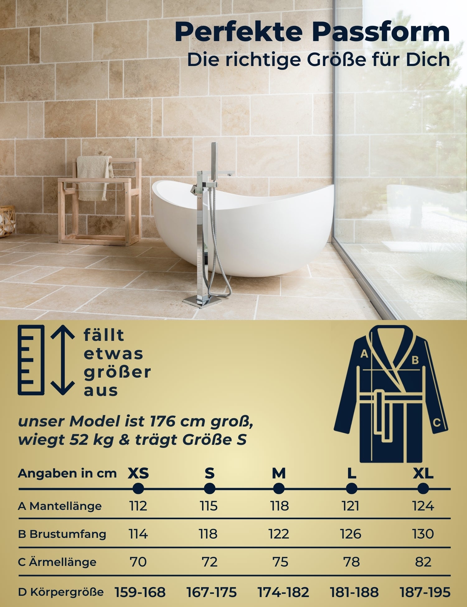 Ob als Sauna Bademantel, Hausmantel, Morgenmantel oder Tagesmantel – unser Frottee Bademantel für Frauen in zeitlosen beige ist stilvoll, schnelltrocknend und ganzjährig einsatzbereit: leicht und atmungsaktiv für heiße Sommertage, angenehme Wärme in kühleren Zeiten.