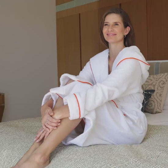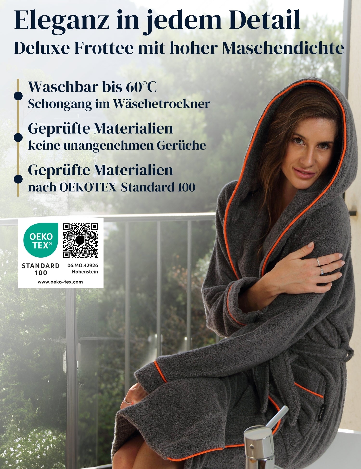 Muévete libremente con esta bata de baño para mujer de color gris delfín , hasta la rodilla, con elegantes ribetes en naranja atardecer: en la sauna, el baño termal, el hammam, el spa o en casa. La generosa capucha proporciona a la cabeza y a las orejas una calidez agradable, y el corte moderno garantiza un ajuste cómodo y una libertad de movimiento sin restricciones.